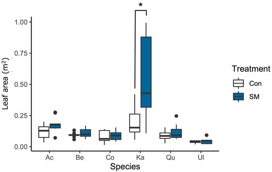 The leaf area of six tree species in June 2017 as influenced by the snowmelt treatment. The white boxes represent the data of the control (Con) and the blue boxes represent the snowmelt (SM) treatment. (n = 9). Ac = Acer mono, Be = Betula platyphylla, Co = Cornus controversa, Ka = Kalopanax septemlobus, Qu = Quercus crispula, and Ul = Ulmus davidiana. *: p < 0.05 by GLMM (for K. septemlobus, GLM analysis).