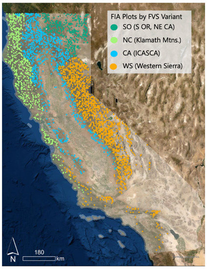 We analyzed data from 3340 FIA plots that met criteria for inclusion (plots for this analysis sampled forest land that remained forest land, contained live trees at the initial visit, and were neither treated nor disturbed by fire), downloaded from the public Forest Inventory and Analysis Database (FIADB) repository (version 7.0, California file, part of the Pacific Northwest Work Unit, at https://apps.fs.usda.gov/fia/datamart/datamart.html (accessed on 10 February 2023)) representing nearly all forested lands in California (Figure 1). These forests span a broad range of productivity classes and forest types, from redwood to California mixed conifer, and include dry forests dominated by oak and pinyon–juniper, where carbon stocks, and growth, are typically much lower. Based on the FIA measurements at the initial visit (2001–2009), when these plots were installed under the annual inventory design, which samples the forest over a ten year cycle via annual panels of plots that are subsequently remeasured in the next ten-year cycle, most forest carbon can be found on Federal lands, except in the Klamath Mountains (NC) variant, where private forests hold more carbon (Table 1). The largest carbon stocks tend to be on forests in the 50–100-year age class, perhaps because these account for the plurality of forest area, except for in the Western Sierra Nevada (WS) variant, where carbon stocks are greatest in 100–150-year-old forests. Including the entire state in this analysis offered the opportunity to evaluate the performance of multiple FVS variants across diverse forest landscapes.