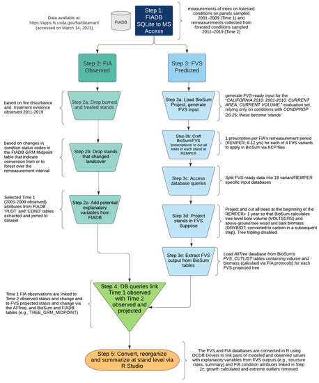 FIA data for the 2001–2009 panels were prepared for modeling in the FVS by loading them into the Bioregional Inventory Originated Simulation Under Management (BioSum) version 5.87 software, which assigned the correct FVS variant for each plot and generated FVS input files for each variant that could be used to perform a grow-only simulation for the remeasurement period (Figure 1) [31]. There were 1301 stands in the WS variant, 867 stands in the Inland California and Southern Cascades (CA) variant, 603 stands in the Klamath Mountains (NC) variant, and 347 in the South Central Oregon and Northeast California (SO) variant. We did not model the 16 stands in the Central Rockies (CR) variant because that variant contains <1% of eligible stands in California and any conclusions reached based on such a small sample would not be generalizable to the variant, which covers many states. The four variants (WS, CA, NC, and SO) were combined with what turned out to be the actual (as opposed to targeted 10-year) remeasurement periods (from as short as 8 to as long as 12 years) to create 18 variant/remeasurement period combinations that were simulated separately with appropriate specifications for the variant and growth period.