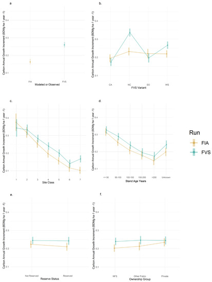 Consistent with the FVS overprediction established by the Bias and Equivalence Tests, the linear model predicts a mean FVS value, 0.259, that is 55% greater than the mean FIA value, 0.162, in Mg of carbon sequestered per hectare per year (Figure 4). For the explanatory variables tested with interaction, linear model-output prediction enables assessment of the FVS effect across those variables. Comparing the interaction term levels across the FVS variant, site productivity, stand age, reserve status, and ownership, we find instances of FVS both over-and under-predicting growth. The differences between the mean FVS- and FIA-predicted increments on these interaction plots are the differences between FVS outputs and FIA observations, holding all other variables constant.