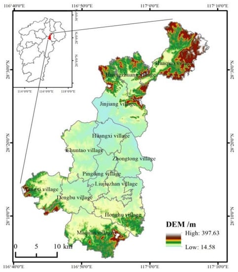 Yujiang District (28°04′–28°37′ N, 116°41′–117°09′ E) is located in the middle and lower reaches of the Xinjiang River, in Yingtan City, Jiangxi Province, China. It is a narrow land area that extends from south to north. The terrain is generally high in the north and south but low in the middle, and it can be divided into the northern hills, central valleys, and southern hills (Figure 1). The major land use types are cultivated land and forest land. This area has a subtropical monsoon climate with annual averages of 17.6 °C and 1788 mm in terms of temperature and rainfall, respectively. By the year 2018, the population had reached 399,900 and the gross regional product was 13.983 billion yuan. Owing to its excellent location for transportation, the study area has a total road length of 1231.3 km.