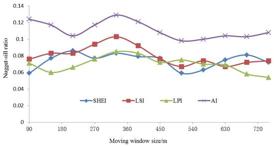 Changes in the nugget–sill ratios of landscape metrics with different moving window sizes. SHEI: Shannon evenness index; LSI: landscape shape index; LPI: largest patch index; AI: aggregation index.