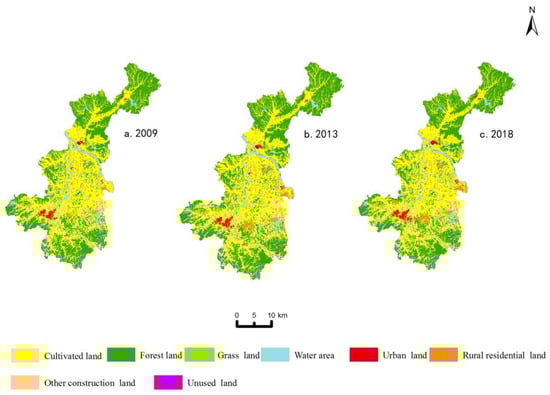 The 2009, 2013, and 2018 land remote sensing data of Yujiang District were retrieved from a remote sensing monitoring database of China’s land use provided by the Resource and Environment Science and Data Center, Chinese Academy of Sciences (https://www.resdc.cn/, accessed on 5 October 2022). We obtained the data by man–machine interactive visual interpretation using ENVI software (Harris Geospatial Solutions Inc., Broomfield, CO, USA) combined with field investigation. The data accuracy was 30 m × 30 m, and the Kappa coefficients of data interpretation in all three periods were >80%, which met the application requirements.