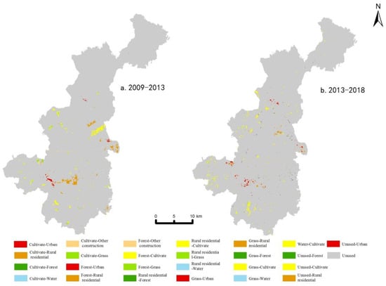 From 2009 to 2013, urban land and rural residential land encroached on the surrounding cultivated land at relatively high rates, and the resulting changes were most pronounced in urban areas such as Dengbu Town and Jinjiang Town (Figure 4). In total, the area of forest land, cultivated land, and grassland shrank by 1096.34, 55.83, and 81.34 ha, respectively. From 2013 to 2018, land use change occurred at remarkably higher rates than that observed between 2009–2013. Forest land and grassland showed the largest transfer-out area of 817.55 and 119.66 ha, respectively. In contrast, the area of urban land and rural residential land expanded by 208.6 and 277.72 ha, respectively. Spatially, the conversion of cultivated land and grassland to urban land mainly occurred around the urban area and other central towns, extending in a divergent manner to the northern and southern mountainous areas. The conversion of other land use types mainly occurred in the central flat area, with low intensity but high dispersity.