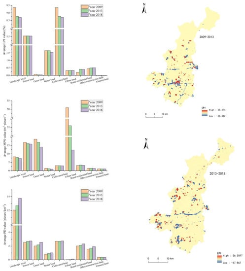 From 2009 to 2013, the change in the LPI was concentrated near the urban area, in contrast to sporadic changes in other areas. From 2013 to 2018, the LPI changed dramatically in the central flat area and around traffic trunk lines, with minimal change in the northern and southern areas (Figure 5). Overall, landscape fragmentation increased in the study area over the 10-year period and the center of change was around the urban area and in the central flat area, but a minimal change in landscape fragmentation was noted in the southern and northern mountainous areas with less human disturbance.