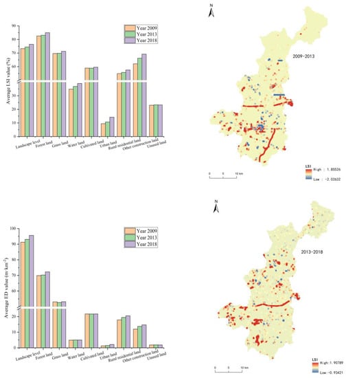 The spatial changes of the LSI and ED were mainly concentrated in the urban area and around major traffic arteries, which represented the primary area of patch shape change in Yujiang District. However, the LSI exhibited a decreasing trend in the central urban area during 2013–2018 compared with that of the 2009–2013 period (Figure 6), indicating the regularization of landscape shape.