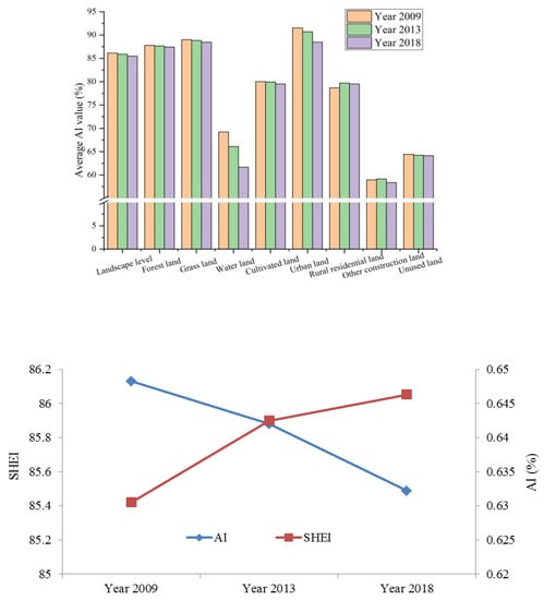 From 2009 to 2018, the AI decreased by 0.75% whereas SHEI increased by 2.51% at the landscape level, indicating an increasing landscape diversity in the study area (Figure 7). However, the intensity of the diversity change was lower than that of landscape fragmentation and patch shape change. At the class level, the AI values of most land use types decreased over the past 10 years, except that the AI of rural residential land increased by 1.03%.