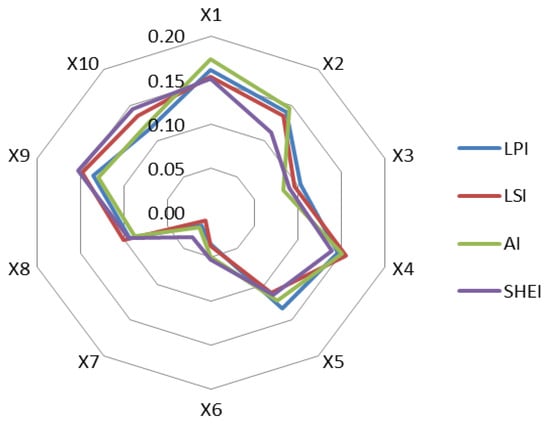 The q-value radar map of factors driving landscape pattern evolution in Yujiang District. X1: elevation; X2: slope gradient; X3: slope direction; X4: gross regional product; X5: population density; X6: average annual temperature; X7: average annual rainfall; X8: Distance from major railways; X9: Distance from major highways; X10: Distance from major waterways. LPI: largest patch index; LSI: landscape shape index; AI: aggregation index; SHEI: Shannon evenness index.