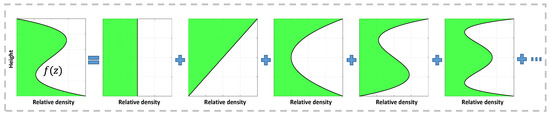 where is a function of and . Note that varies for different baseline interferometers because of . In summary, the core principle of PCT, which is to use a set of standard Legendre polynomials to fit and approximate the relative reflectance function that is difficult to mathematically model, is shown in Figure 2. Therefore, for the dual-baseline PolInSAR solution in this paper, the reconstruction of the vertical structure function is expressed by a third-order polynomial in the form of: