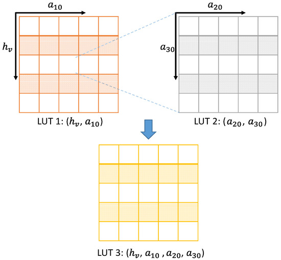 To solve the parameters to be estimated, and in this case, this paper uses the dual-baseline lookup table (LUT) method to obtain accurate forest height and vertical structure parameters. As shown in Figure 3, we built two two-dimensional lookup tables. The first two-dimensional lookup table consists of two parameters, and , and the second lookup table consists of and . For each resolution unit, each table element in the first lookup table was sequentially combined with all elements in LUT 2 to form a set of candidate parameter solutions. For each element in LUT 1, and are fixed, so the first baseline observation information can be utilized to obtain an optimal and as the correspondence in LUT 2. A series of optimal solution spaces for the first baseline are obtained according to the following formula. The value is written as:
