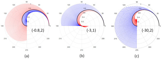 We use Formula (7) to explore the effect of different undetermined coefficient values on the coherence coefficient on the complex plane circle. As shown in Figure 5a–c show the changes of on the complex plane when only considering the value changes of , and , respectively. We use red to represent the coverage area of the coherence coefficient on the complex plane circle when the value is positive, blue to represent the area covered when the value is negative, and a black curve to represent the corresponding curve when the value is 0. On this complex plane circle, the following three points are noted:
