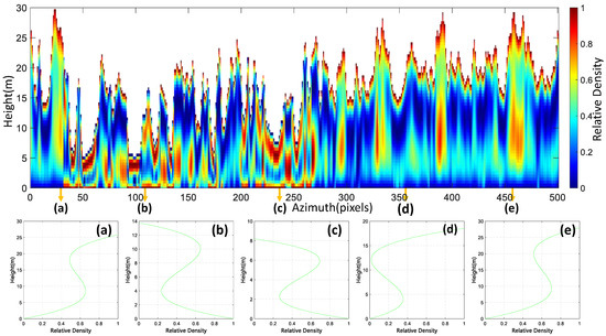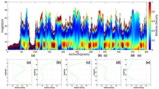 The lower panels (a) to (e) in Figure 6 represent the vertical structure scattering profile functions for five pixels (90th, 331st, 350th, 450th, and 470th pixels along the azimuth direction (row)) randomly picked from the above polarization tomogram. Based on this structure scattering function, the peak height of vegetation canopy scattering can be obtained. In addition, the vertical structure profile functions of (a) to (e) are basically different: they have different heights and different scattering structures. This also proves that the structure of tropical forests is complex, and that the scattering structure function that only assumes an exponential distribution in the vertical direction is not consistent with the vertical scattering of tropical forests.