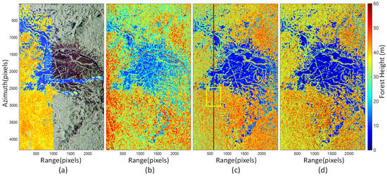 PolInSAR forest height retrieval results for tropical forest at Lope. (a) The LVIS LiDAR forest height product is overlaid on the Pauli RGB composite map; (b) dual-baseline PolInSAR forest height inversion results based on the RVoG model; (c) dual-baseline PolInSAR forest height inversion results based on the PCT model; (d) dual-baseline PolInSAR forest height obtained by correcting the height of canopy scattering peak.