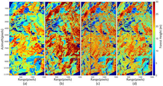 PolInSAR forest height retrieval results for boreal forest at Krycklan. (a) LiDAR forest height product, (b) dual-baseline PolInSAR forest height inversion results based on the RVoG model, and (c) dual-baseline PolInSAR forest height inversion results based on the PCT model; (d) dual-baseline PolInSAR forest height obtained by correcting the height of canopy scattering peak.