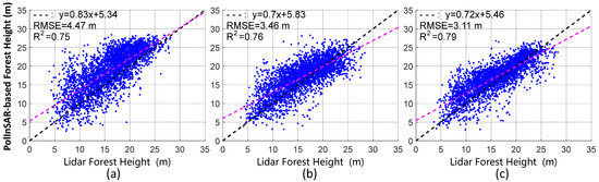 Figure 8 shows the scatterplot of the accuracy validation between the retrieved dual-baseline PolInSAR forest height and the LiDAR forest height. The size of pixels (260 m 260 m) in the PolInSAR forest height result serves as a forest window for accuracy verification, and the average filtering was performed in this window. The experimental results were compared with the LVIS forest height products of the same resolution. The root mean square error (RMSE) and coefficient of determination (R2) were selected as evaluation indicators for comparison. For the tropical forest area at Lope, a total of 154,319 plots were counted, of which a height of less than 3 m was considered to be grassland and was masked.