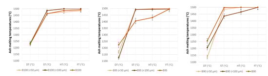 Figure 5 shows differences between the melting temperatures from ash prepared at 815 °C and fuel consisting of pure beech, beech blended with 5% of FFP2 masks, and beech blended with 10% of FFP2 masks. The results of the beech ash samples produced at 815 °C again showed few differences in the ash behavior between the individual sieved and non-sifted samples, similar to the spruce samples prepared at 550 °C. The beech pellets had significantly smaller differences in the DT temperature. The presence of FFP2 masks in the beech pellets also only insignificantly affected the values of the melting temperatures in this case.