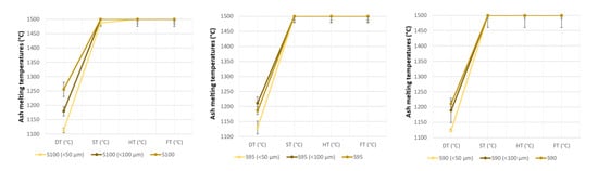 Based on the measured results, it can be summarized that the melting temperature that differs the most is DT, and the other melting temperatures are more difficult to observe for woody materials because the ash melting analyzer only works up to 1500 °C. The lowest recorded DT was 1113 °C for the pure spruce sample, with the ash size smaller than 100 µm. The highest DT was almost 1256 °C for the non-sifted beech sample with 10% of FFP2 masks and also for the non-sifted pure spruce sample. All deformation temperatures were higher than 1100 °C and even higher than 1200 °C for some samples.