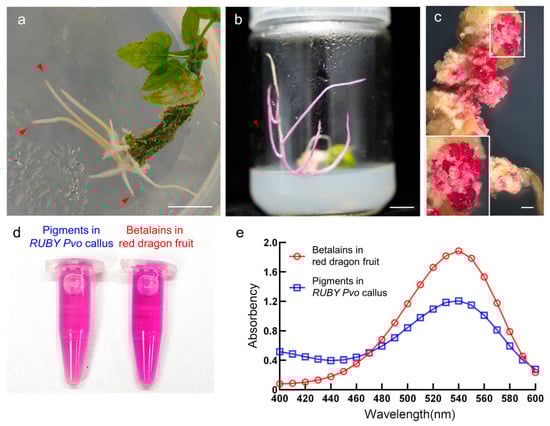 Induction of RUBY transgenic hairy roots and callus of P. volubilis and pigment identification. (a) DR5::RUBY transgenic hairy roots, the red triangles indicate the RUBY-colored root tips. (b) 35S346 bp::RUBY transgenic hairy roots. (c) Red callus induced from RUBY transgenic hairy roots of P. volubilis. The inset in the lower left corner is an enlarged image of the white box in the upper right corner, showing red callus induced from RUBY transgenic hairy roots. (d) Extracted pigment from RUBY callus of P. volubilis and red dragon fruit. (e) Absorption spectrum of the pigment from transgenic RUBY callus of P. volubilis and red dragon fruit (scale bar = 1 cm).