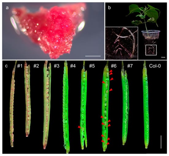Nondestructive analysis of ectopic expression of RUBY in P. volubilis and Arabidopsis. (a) Red transgenic callus induced from RUBY transgenic hairy roots of P. volubilis as explants. (b) P. volubilis chimeric plants. (c) Dissected silique of RUBY transgenic Arabidopsis lines #1–#7, the red triangles indicate red coloration (scale bars in (a,b) = 1 cm, scale bar in (c) = 200 μm).
