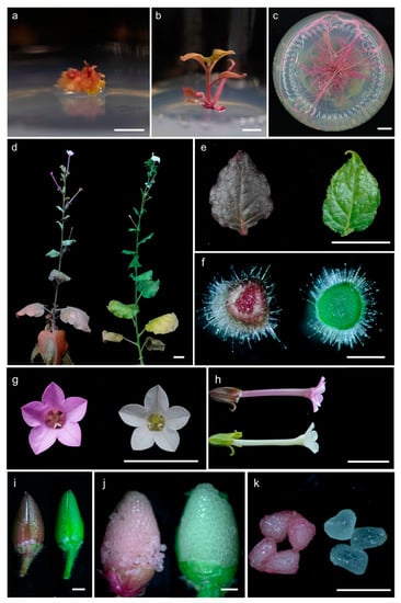 The phenotype analysis of RUBY transgenic N. benthamiana plants. (a,b) RUBY transgenic adventitious bud regenerated from N. benthamiana leaf. (c) RUBY transgenic N. benthamiana plant induced roots. (d) The whole plant morphology of RUBY transgenic N. benthamiana (left) and WT (right), the same below. The leaf (e), stem (f), flower (g,h), and fruit (i) morphology of RUBY transgenic N. benthamiana and WT. Peeled semimature fruit (j) and seeds (k). (Scale bars in (a–e,g,h) = 1 cm, scale bar in (f,i–k) = 1 mm).