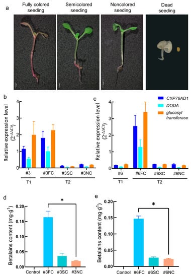 To further explore the relationship between RUBY expression stability and red coloration in heredity, two representative RUBY transgenic Arabidopsis lines, #3 and #6, were selected for further analysis. First, the RT−qPCR analysis showed that the expression levels of CYP76AD1, DODA, and glucosyl transferase in fully colored seedlings of the T2 generation of line #3 were the same as those of the T1 generation (Figure 6b). The expression levels of three genes in the T1 generation of line #6 were very low, but they were highly expressed in the T2 generation of fully colored seedling (Figure 6c). Moreover, we found that the expression levels of the three genes were very low in the semicolored and noncolored seedlings of the T2 generation of lines #3 and #6, and they showed no significant difference (Figure 6b,c). Second, we extracted betalain from the fully colored, semicolored, and noncolored seedlings in the T2 generation of lines #3 and #6. The results showed that the contents of betalain were consistent with RT−qPCR detection: the betalain contents of the fully colored seedlings were high, while the semicolored and noncolored seedlings had lower contents, and the difference between the latter two was not significant (Figure 6d,e). The above experiments further proved that the inconsistent red coloration in RUBY transgenic Arabidopsis was caused by its unstable expression. It is implied that the RUBY fusion gene might have transcriptional abnormalities in transgenic Arabidopsis, but it could also be due to RNA processing or other post-transcriptional regulation not known for RUBY.