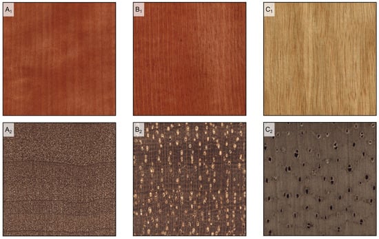Hardwood texture (longitudinal and transverse sections). (A1,A2): fine texture (Pyrus communis); (B1,B2): medium texture (Baillonella toxisperma); (C1,C2): coarse texture (Terminalia superba).