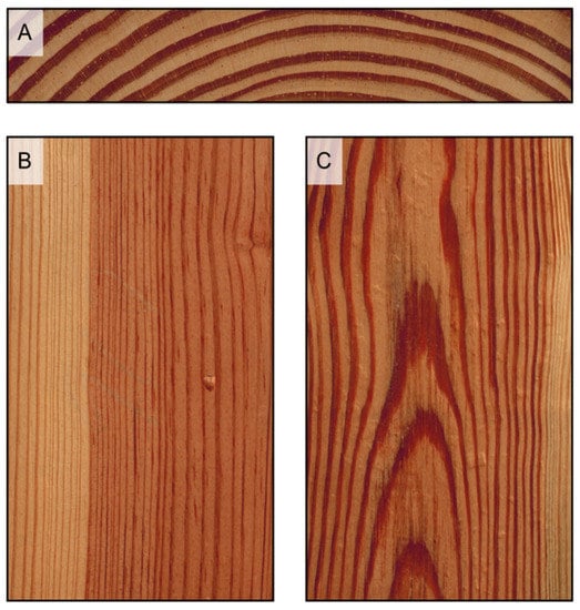 Most of the wood in conifers consists of axial tracheids [,]. Parenchyma cells occupy a smaller fraction of conifer woods’ volume and are organized in the radial tissues (parenchyma rays) and, in a few species, in axial strands. Earlywood tracheids, being wider and thinner-walled compared to latewood tracheids, appear lighter in color in transverse and longitudinal sections. Even if of variable width, depending on the species and year-to-year variation of growing conditions, the latewood always appears darker in color []. Parenchyma rays in conifers are uniseriate and therefore not visible to the naked eye on transverse and tangential sections. However, on radial surfaces, especially those obtained by splitting—not sawing—the wood, parenchyma rays might be visible as linear ribbon-like shining structures. Axial parenchyma, either scattered or tangentially oriented, is hardly visible to the naked eye but detectable under a low magnification lens.