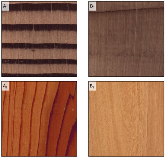 Earlywood/latewood transition. Pseudotsuga menziesii is an example of abrupt transition ((A1), transverse section) and evident wood figure is ((A2), tangential section); Cupressus sempervirens is an example of gradual transition ((B1), transverse section) and faint wood figure ((B2), tangential section).