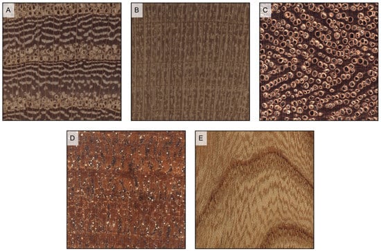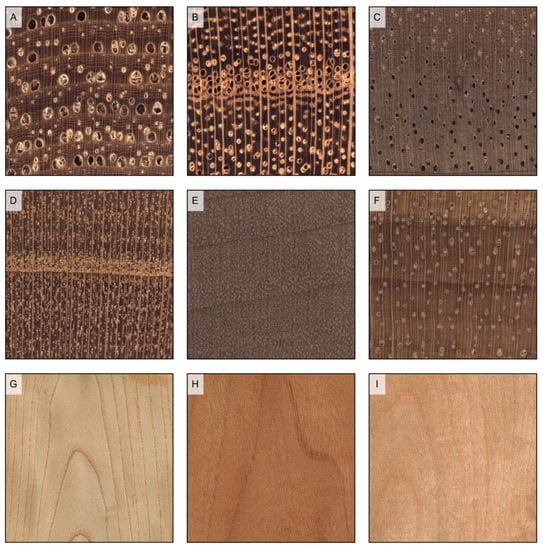 - Ruffinatto, F.; Crivellaro, A. Atlas of Macroscopic Wood Identification: With a Special Focus on Timbers Used in Europe and CITES-Listed Species; Springer: Cham, Switzerland, 2019; p. 439. [Google Scholar] [CrossRef]