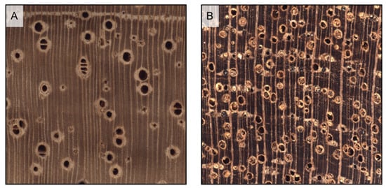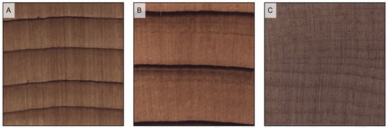 Growth rings are almost always distinct and visible in softwoods, while they can be indistinct in many tropical hardwoods. Caution should be paid when using growth rings for identification since their presence can be variable in several tropical hardwoods [,], and they can be difficult to detect macroscopically in numerous temperate ones (Table 6). Additionally, wide bands of parenchyma (e.g., Millettia spp.) and seemingly marginal bands of parenchyma (e.g., Swietenia spp.) (see “Section 7.2”) can be misinterpreted as growth ring boundaries.