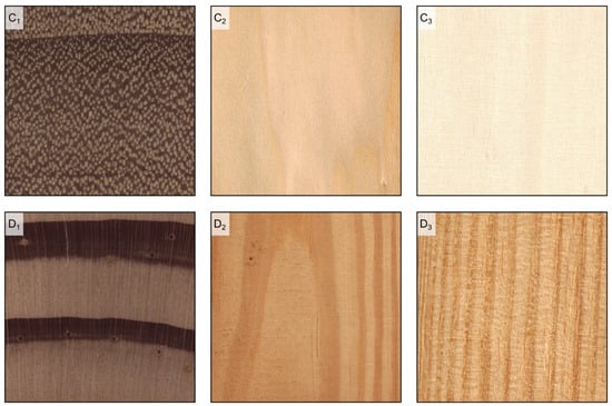 Rays’ visibility to the naked eye. In Quercus petraea, some of the rays are clearly more evident than the others on the transverse surface ((A1) transverse section), are visible on the tangential surface and over 5 mm high ((A2) longitudinal tangential surface), and visible on the radial surface ((A3) longitudinal radial surface); in Platanus occidentalis, rays are visible on the transverse surface and noded ((B1) transverse section), they are visible on the tangential surface and less than 5 mm high ((B2) longitudinal tangential surface), and visible on the radial surface ((B3) longitudinal radial surface); in Populus tremula, rays are not visible on either the transverse surface ((C1) transverse section) and the tangential surface ((C2) longitudinal tangential surface), while barely noticeable on the radial surface ((C3) longitudinal radial surface); in Pinus sylvestris, rays are not visible on either the transverse surface ((D1) transverse surface) and the tangential surface ((D2) tangential surface), while barely noticeable on the radial surface ((D3) longitudinal radial surface).