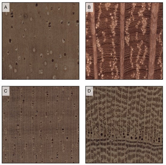 The wood of hardwoods is more heterogeneous and consists of vessels, fibers, fiber tracheids s.l., and axial and radial parenchyma [,]. Vessels are circular, oval to polygonal in the transverse section, and are differently organized within the ring boundaries. Fibers usually appear darker in color compared to the other cell types as seen in the transverse section, whereas fiber tracheids and axial parenchyma usually appear lighter-colored []. The appearance of rays varies with their width. Wide rays are visible in all observation planes, but smaller rays might be visible only on one surface. As a rule of thumb, only rays larger than 6–8 cells are visible to the naked eye on all the planes of observation, however, the overall color of the wood also influences their appearance.