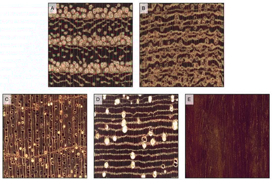 Vessels’ arrangement (all transverse sections except (E)). (A) tangential bands (latewood vessels only) (Ulmus glabra); (B) radial pattern (Ilex aquifolium); (C) diagonal pattern (Eucalyptus deglupta); (D) dendritic pattern (Bulnesia sarmientoi); (E) jagged pattern on longitudinal tangential surface determined by wavy tangential bands of latewood vessels (Ulmus glabra).