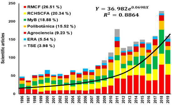 From 1996 to 2019, 2384 articles were published in Mexico of purely forestry studies; 257 corresponded to the period 1996–2000, 705 to 2001–2010, and 1422 to 2011–2019; 65.73% of the studies published were focused on three of the seven journals analyzed: RMCF (26.51%), RCSCFA (20.34%), and MyB (18.88%). An exponential trend was seen in the increase of publications (R2 = 0.8864) (Figure 1). Gómez and Hernández [37] and Martínez-Santiago et al. [7] attribute this growth to the policies that Conacyt implemented in 1984 with the creation of the National Researchers System (Sistema Nacional de Investigadores, SNI) and the admission of more master and doctoral degrees to the PNPC program of Conacyt (Padrón Nacional de Posgrados de Calidad). However, Bravo-Vinaja and Sanz-Casado [38] and López-Leyva [36] consider that the increase in the number of publications Mexico has produced since the creation of the SNI has only been in quantity and not in quality, which is reflected in the low impact of Mexican journals.