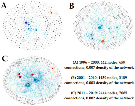 From the 2384 articles analyzed, 1603 different first authors were found. Between the author and collaborators, there were a total of 3798 different individuals. Figure 2 shows an increase in the number of authors (nodes) and connections between authors of the network (connections) for the period analyzed. However, the density of the co-authorship network has decreased, and the interactions in the network results are very weak. The density is an indicator of the Social Network Analysis (SNA) implying that the nodes interact (are connected) with one another; mathematically, it is a value within the 0–1 interval, and the closer to 1 the interaction, the greater the network [42].