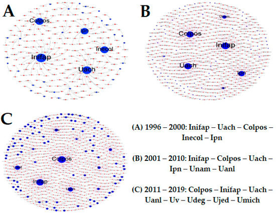 From 1996 to 2019, there were a total of 473 institutions that appeared as adscription sites of the authors who published forestry texts in Mexican journals. By taking as reference the institution of the first author, where according to Sanjuanelo et al. [45] the research is developed, it was found that from 1996–2000 there were a total of 34 different institutions; from 2001–2010 it doubled to 74, and from 2011–2019 it tripled to 122. However, only three institutions published a significant amount of texts in each of the analysis periods: Universidad Autónoma Chapingo (Uach), Instituto Nacional de Investigaciones Forestales, Agrícolas y Pecuarias (Inifap), and Colegio de Postgraduados (Colpos). This is because, according to Conacyt [28], Uach, Inifap, and Colpos are the institutions with the largest number of registered forestry researchers. (Figure 3).