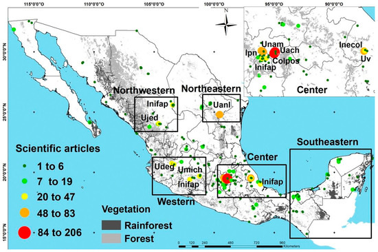 For the spatial representation of the number of articles per institution that were published from 1996 to 2019, the institution of the first author was considered (on their different campuses, according to the case). It was found that the publication of forestry research in Mexico was concentrated mostly in the center of the country in institutions such as Inifap, Colpos, Uach, Inecol, Ipn, and Unam. The western region was represented by Udeg, Umich e Inifap; the northwestern by Ujed and Inifap; and the northeastern by Uanl. However, for the southeastern region, a leading institution in the publication of forestry themes has not been found. According to Aguirre-Calderón [46], this is because the rainforest vegetation is located mostly in the southeast of Mexico, and due to tradition, forestry research has been developed in forest vegetation that is located mainly in the north of the country (Figure 4).