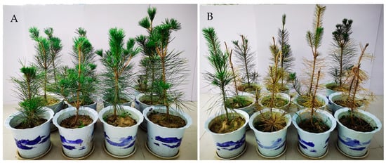 Effects of PWN infection on black pine seedlings. (A) The control group (CK). (B) The treatment group (BL).