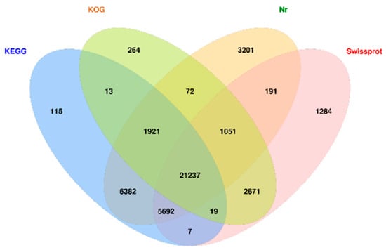 A total of 44,120 (43.65%) genes were successfully matched with known genes in public databases, and approximately 39,747 (39.3%), 35,386 (35%), 27,248 (27%) and 32,152 (31.8%) unigenes were annotated in the Non-Redundant Protein Sequence Database (Nr), Kyoto Encyclopedia of Genes and Genomes (KEGG), Clusters of Orthologous Groups of proteins (COG) and Swiss Protein (Swiss-Prot) databases, respectively. A total of 21,237 unigenes were annotated simultaneously in these four databases (Figure 2).