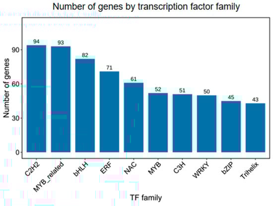 In our study, the predicted protein sequences were compared with the corresponding Transcription factors (TF) database (plant tfdb/animal tfdb) with hmmscan. A total of 1046 transcription factor genes were detected. The statistical results of TF classification families are shown in Figure 3. The top 10 TF families in terms of the number of unigenes are C2H2 (94), MYB_related (93), bHLH (82), ERF (71), NAC (61), MYB (52), C3H (51), WRKY (50), bZIP (45) and Trihelix (43).