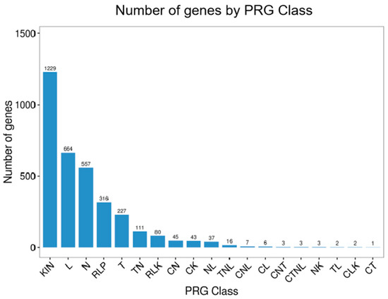 According to the plant resistance (R) gene database, a total of 3352 candidate R genes were identified in the black pine transcriptome. According to the different conserved domains, the R genes can be divided into different categories, in which the gene numbers of KIN (related domain Kinase, TM), L (LRR), N (NBS, TM), RLP (LRR, TM), T (TIR, TM) and TN (NBS, TIR, TM) are 1229, 664, 557, 316, 227 and 111, respectively, and the others are less than 100, or are even single digits (Figure 4).
