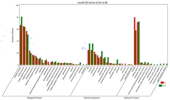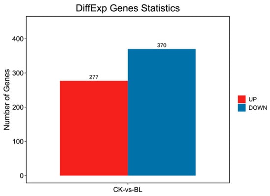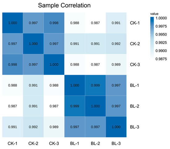 According to the manufacturer’s operating instructions, the total RNA of the needles of the control group (CK) and the treatment group (BL) was extracted using a Trizol Kit (Invitgen, Carlsad, CA, USA). Random primers were used to reverse transcribe RNA into the first-strand cDNA, and then the second-strand cDNA was synthesized. The cDNA production was purified using a QiaQuick PCR extraction kit, repaired at the end and added to PolyA. Polymerase chain reaction amplification (PCR) and sequencing were carried out with an Illumina HiSeq2500, and then the transcriptome data were assembled and annotated. The cDNA libraries of CK and BL (three replicates each) were constructed, sequenced and evaluated. The above processes were conducted by Gene Denovo Biotechnology Co (Guangzhou, China).