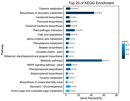 In our study, 647 DEGs were annotated into 58 metabolic pathways, and Figure 8 shows the 20 most representative pathways. Among them, DEGs show significant differences in the thiamine metabolic (ko00730), biosynthesis of secondary metabolites (ko01110), carotenoid biosynthesis (ko00906), flavonoid biosynthesis (ko00941), terpenoid backbone biosynthesis (ko00900) and plant–pathogen interaction (ko04626) categories, and the number of differential genes accounts for the largest proportion in biosynthesis of secondary metabolites (32) and metabolic paths (41). The significant enrichment analysis based on KEGG pathways showed that PWN infection affected the secondary metabolism of black pine needles; these metabolites may be the main chemical defense substances in plants.