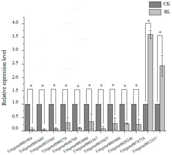 Twelve DEGs were randomly selected, and gene-specific primers were designed for qRT-PCR analysis to detect the gene expression level and verify the accuracy of transcriptome data (Table 2). It is shown that the DEGs proved by qRT-PCR were highly consistent with the results of transcriptome sequencing analysis (Figure 9). Specifically, ten unigenes, including unigene0001984, unigene0083685, unigene0033503, unigene0000278, unigene0048705, unigene0083090, unigene0003367, unigene0035857, unigene0005880 and unigene0020248 were downregulated, and two unigenes, including unigene0074724 and unigene0012357, were upregulated. Based on the above analysis, the qRT-PCR analysis results are considered to support the reliability of the sequencing data. The difference between groups may be related to the batch difference between samples.