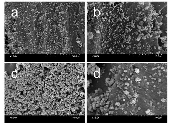 The discontinuous FSNP layer on the cell wall surfaces is the result of the low concentration of the FSNPs in the modifying suspension (1.5 and 2 wt.%). This meets the objective of keeping the amount of FSNPs in the wood low. The loose/porous structure of FSNP deposits is clearly shown in Figure 1c,d. Although the determination of the diameters of FSNP spheres is difficult, because they overlap in the image, a rough estimation of the globule size is 50 to 200 nm.