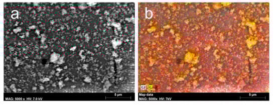 EDX map of FSNP-treated (FSNP1.0) pine wood in tangential section. (a) SE image of an FSNP-treated earlywood tracheid cell wall surface. (b) Distribution of Si and F elements on the same surface, combined with SE image. Red color indicates presence of fluorine, yellow color indicates presence of silica.