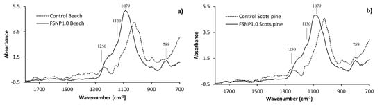 SNV-transformed FT-IR spectra of control and FSNP1.0-modified wood: (a) beech, (b) Scots pine.