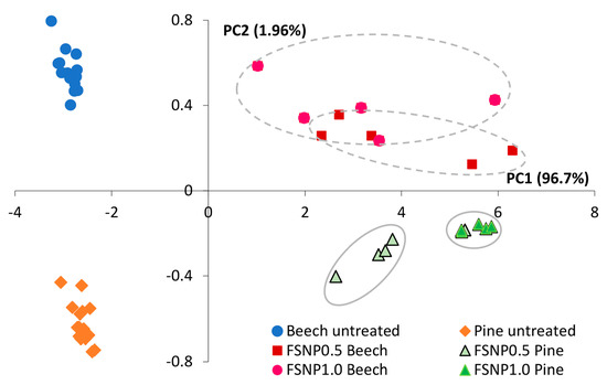 PCA score plot of the untreated and FSNP1.0-modified wood in the 1800–800 cm−1 spectral region.