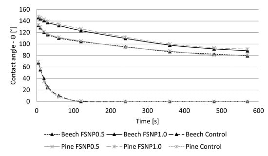 Contact angles as a function of time on control and FSNP-modified beech and Scots pine wood surfaces.