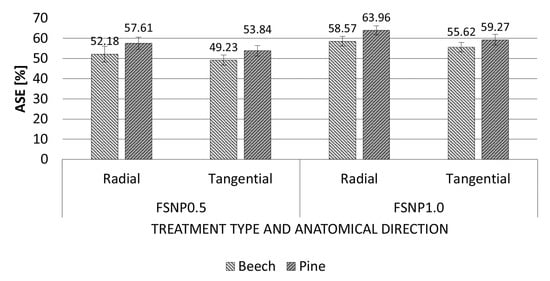 ASE of FSNP-modified beech and Scots pine wood in radial and tangential directions (whiskers show standard deviation of the results).